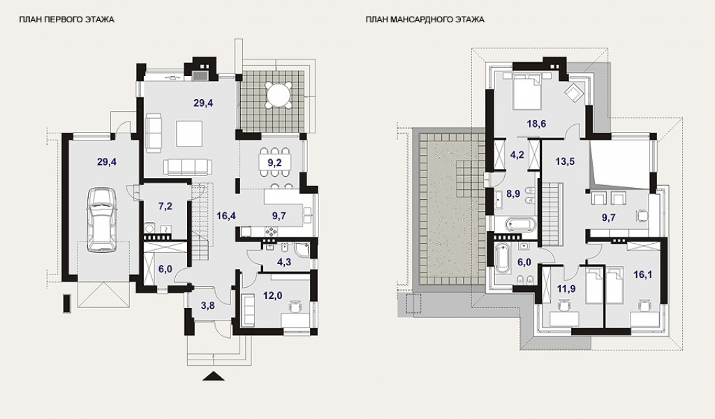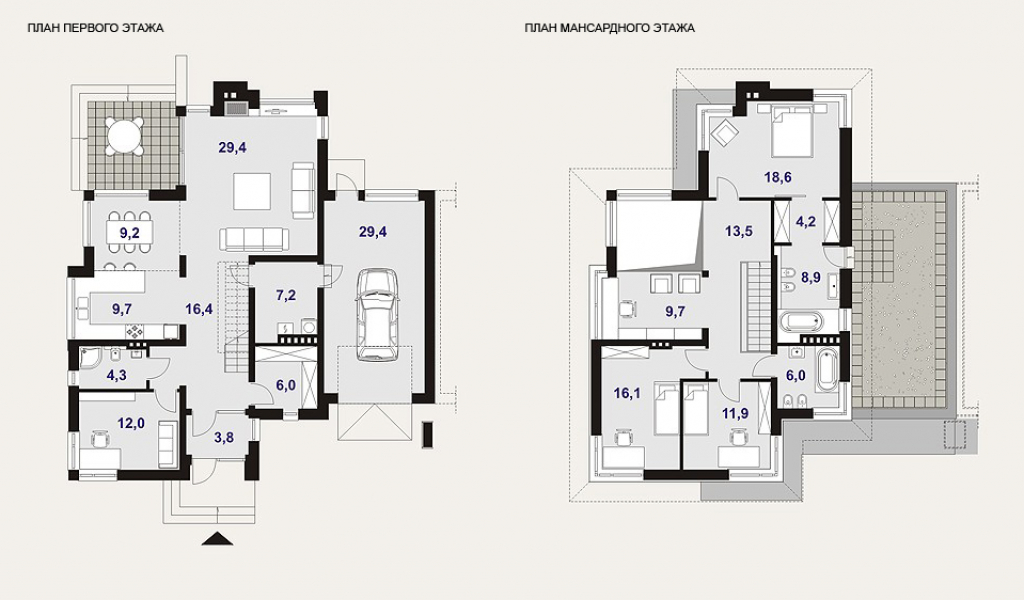 Продолжение популярного проекта дома <Классический 1>. Основное отличие этого проекта в том, что над гаражом отсутствует скат кровли, поэтому существует возможность построить блокированный дом на две семьи.